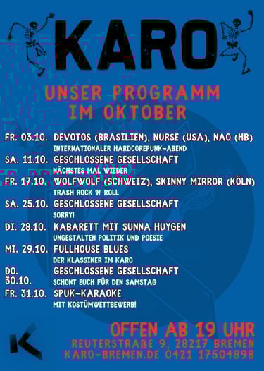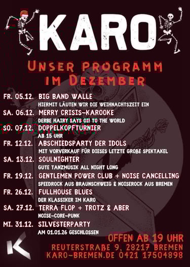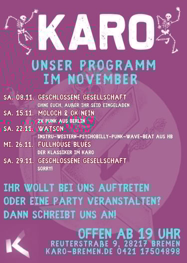 Liebe Freunde der pechschwarzen Verführung. Ab sofort gibt es im Karo den Black Thirstday. In gemütlicher Atmosphäre, irgendwo zwischen Punkrock und Christian Steiffen, mit netten Stammgästen und immer wieder neuen Gesichtern.