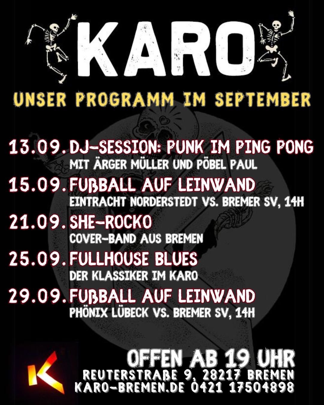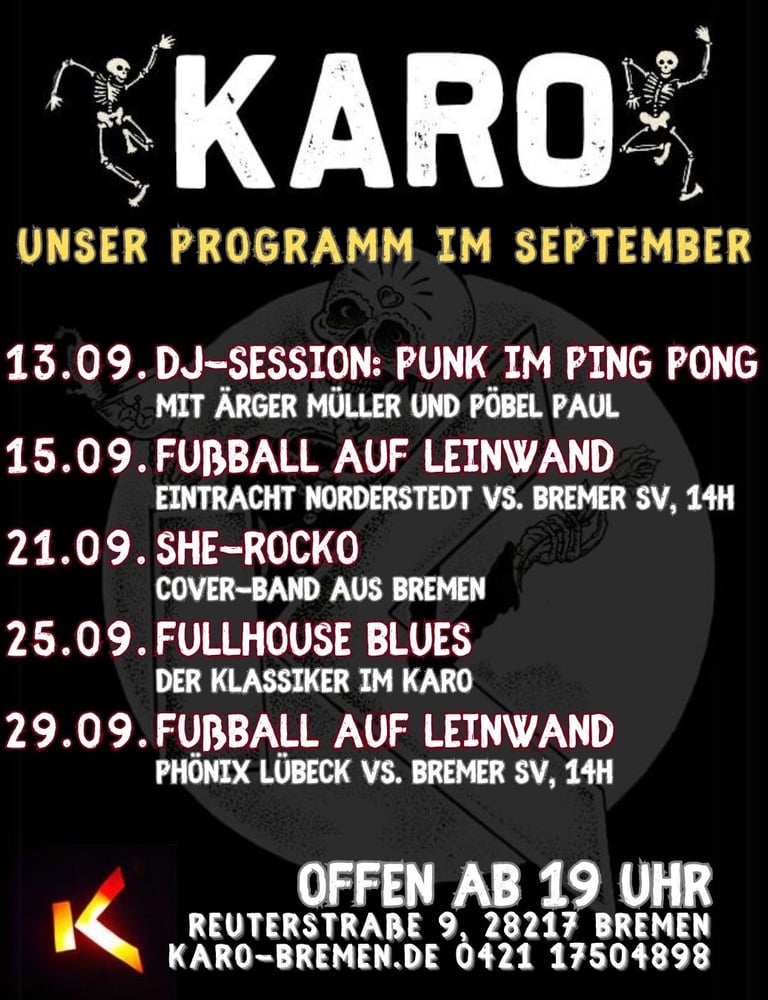„So, liebe Leute! Das Viertel haben wir nun gehabt und für’s Erste hinter uns gelassen. Nun geht’s rüber nach Walle, genauer gesagt ins Karo. Wir freuen uns drauf und natürlich auf Euch, die Ihr zahlreich erscheinen mögt, um mit uns das Westend ordentlich zu rocken.
