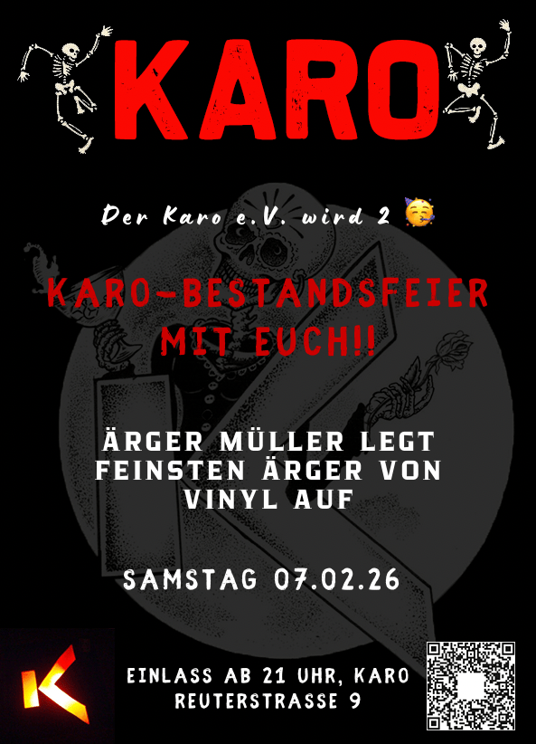 Liebe Freunde der pechschwarzen Verführung. Ab sofort gibt es im Karo den Black Thirstday. In gemütlicher Atmosphäre, irgendwo zwischen Punkrock und Christian Steiffen, mit netten Stammgästen und immer wieder neuen Gesichtern.